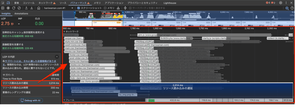 「リソース読み込みの遅延」のタイムラインの中で、LCP対象コンテンツより優先度の低そうなリソースが先にダウンロード開始されている場合は見直しの余地がありそうです。