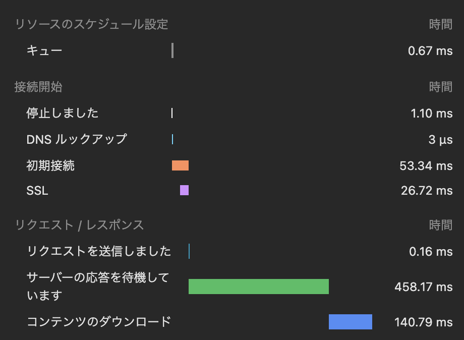 このタイミングの内訳の「サーバーの応答を待機しています」までが、Time to First Byte(TTFB)の内訳になります。