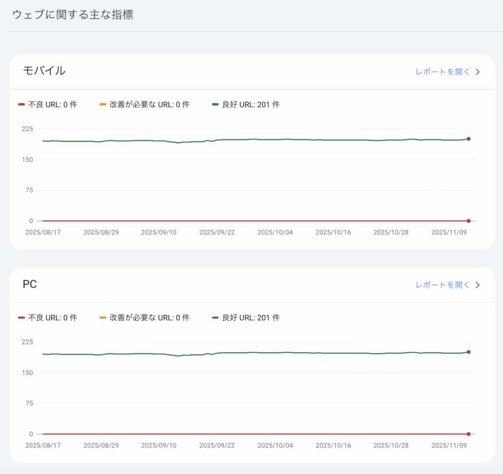 PageSpeed Insightsの中の「フィールドデータ」の中のCore Web Vitalsですが、Google Search Consoleからも確認が可能です。