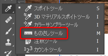 そういうときは仕方ないので、「ものさしツール」を使っておおよその距離を測ります。ものさしツールはスポイトツールとかと同じ場所にいます。