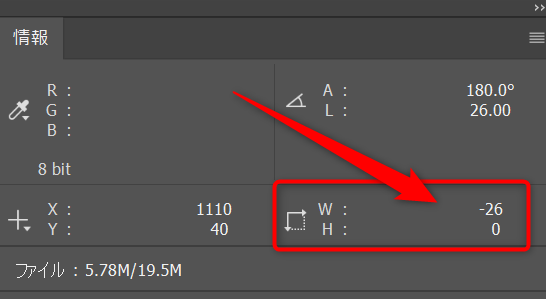 ものさしの値を確認できるのは、「情報パネル」になります。ウィンドウ → 情報 を開きます。