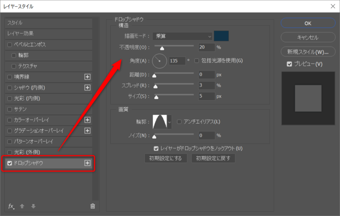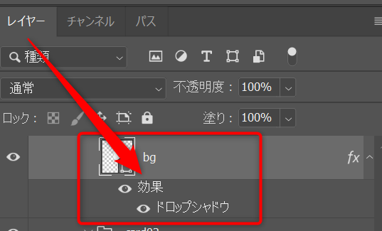 そこで、該当のレイヤーを見てみると、、、何やら「効果」があたっているっぽいです。
