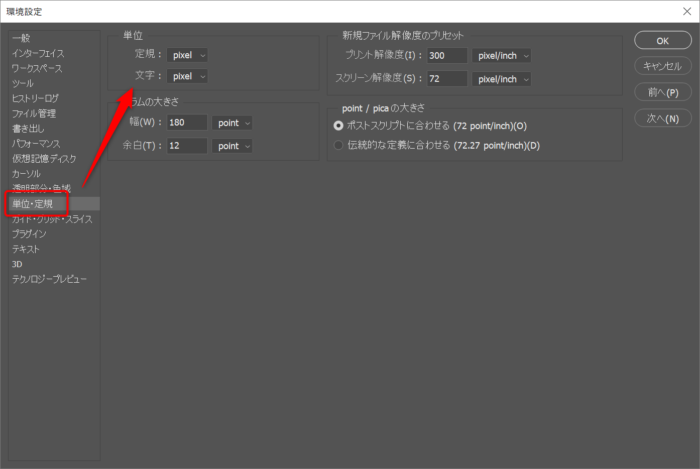 Web系の値で取得する必要があるので、「環境設定」から単位を「ピクセル」に変更しておきます。