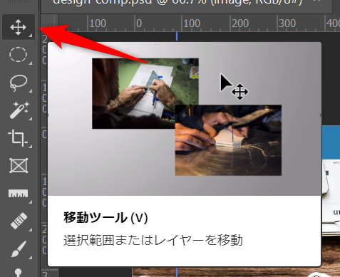 画像として保存したいオブジェクトを移動ツールで選択します。移動ツールは右上にある十字の矢印アイコンのものです(ショートカットキーだとVで切り替わります)