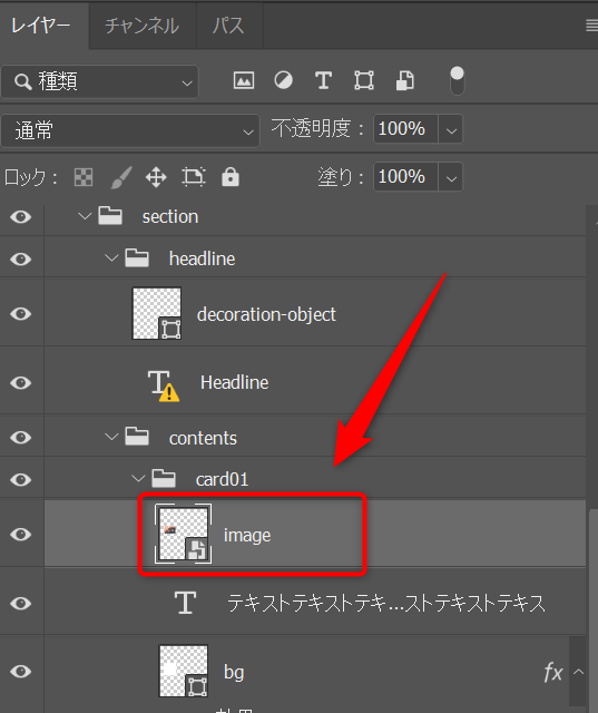 Photoshop内に配置されている画像を保存する方法です。「書き出し」という表現をするのですが、デザインカンプからの画像の書き出しは一般的にはコーダーの役割とされています。