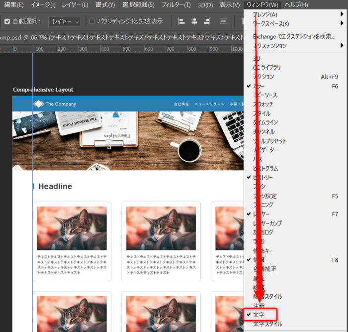 ウインドウ → 文字 を選択して「文字パネル」を開きます。