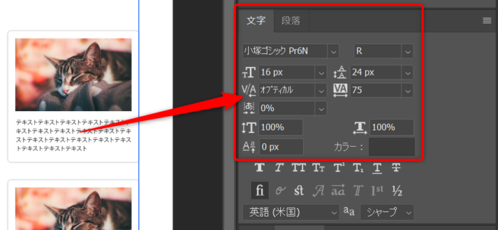 選択ツール or 文字ツールで知りたい文字エリアを選択すると、その文字に関する情報を表示してくれます。