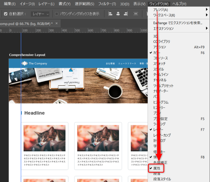 ウインドウ → 属性 を選択して「属性パネル」を表示します。