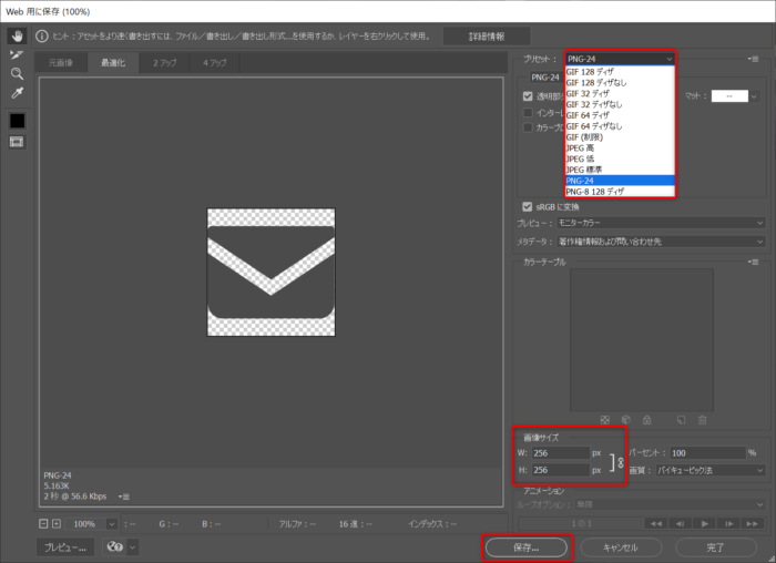 基本的に気にする項目としては、プリセットと画像サイズの2箇所です。プリセットで画像の保存形式を選択して、画像サイズで画像の大きさを決めます。問題がなければ「保存」ボタンから保存先のフォルダーを選択して保存することが可能です。