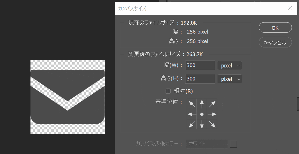 「変更後のファイルサイズ」から、余白をつけた後の画像サイズを指定します。「基準位置」でどの方向に余白を追加するかを指定できます。この場合は全方向に均等に余白が追加されます。