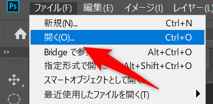 画像の開き方は2パターンあります。1つ目は、ファイル → 開く から開きたい画像ファイルを選択する方法です。ショートカットだとCtrl + O(アルファベットのオー)でもOKです。