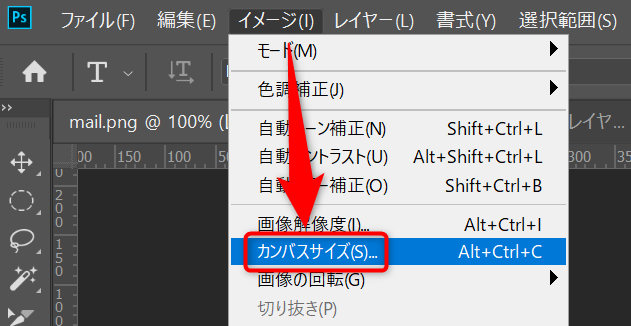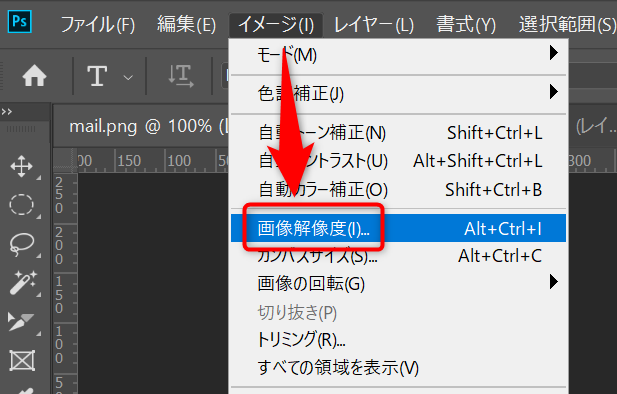 イメージ → 画像解像度 から画像のサイズを操作できます。
