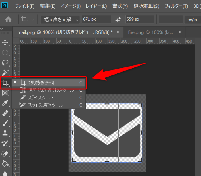 切り抜きはツールボックスから利用できます。四角がズレたようなアイコンを選び「切り抜きツール」を選択します。(ちなみに長押しでクリックすることで項目が表示されます)