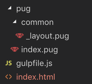 フォルダの構成としては以下のような感じで作りました。pugファイルの位置はなんでもいいのですが、gulpfileでの変わってくるという感じですね。この記事のコピペで同様に進めたい方は下記のフォルダ構成を真似してもらえたらと思います。