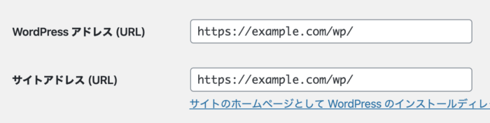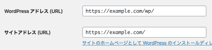 /wp/配下でインストールされたWordPressサイトだと、管理画面の設定 → 一般を見ると、「WordPressアドレス」と「サイトアドレス」が以下のようになっているはずです。