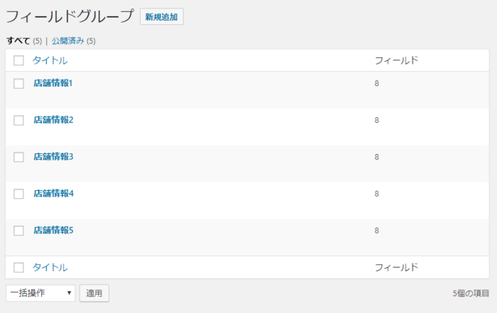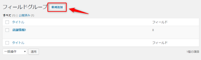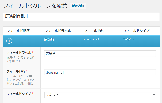 サイドメニューの「カスタムフィールド」をクリックすると、先程追加した「店舗情報1」が登録されていることが分かります。上の新規追加から同じものを5つ作っていきましょう。