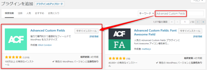 続いて書く項目を入力しやすくするためのカスタムフィールドを作っていきます。UIを使いやすくするために「Advanced Custom Fields」というプラグインを使ってカスタムフィールドを拡張しましょう。
