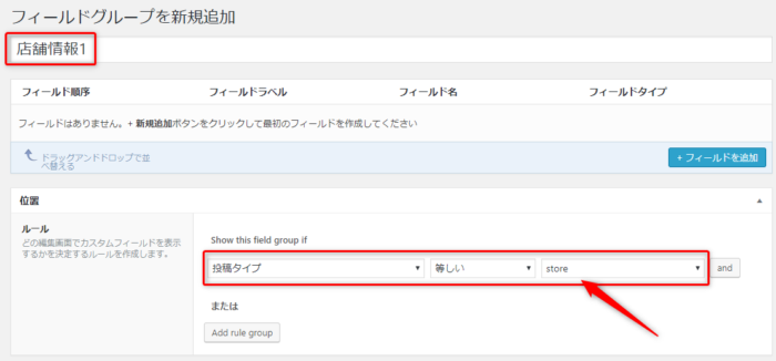 「店舗情報1」タイトルを入力して、投稿タイプを先程作成した「store」を選択します。