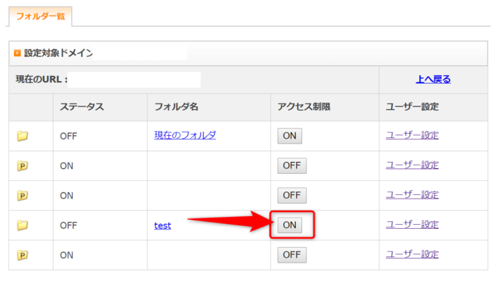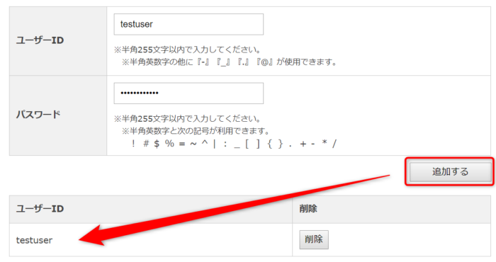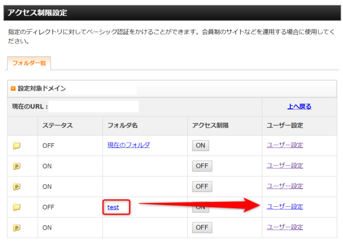そして、先ほど作成した「test」というフォルダに対してベーシック認証のユーザーを作っていきます。