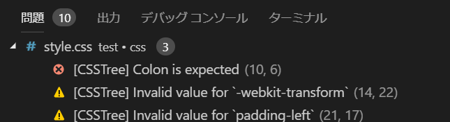CSSのエラー箇所も、「問題パネル」に表示されるようになります。