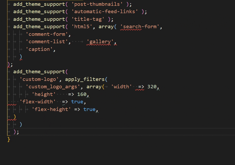 赤字の箇所が「WordPress Coding Standards」でエラーになっていた箇所ですが、保存時に見事に消えています。