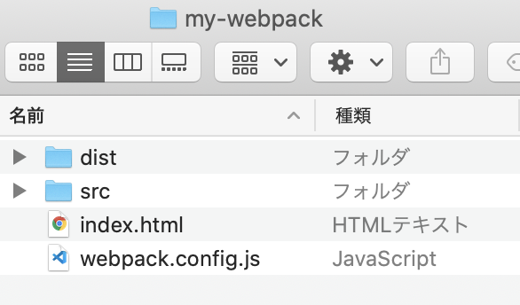 my-webpackというフォルダを作成して、以下のようなファイル構成でデモを作成しています。同様に進めたい場合は用意しておいてください。