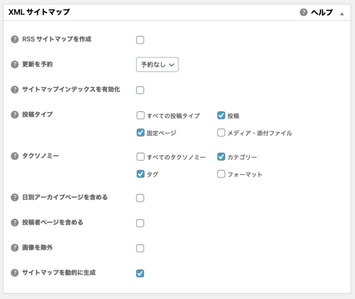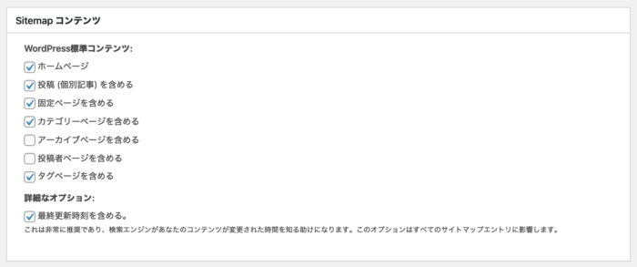 こちらも同様にサイトマップとしてい生成した必要なページにだけチェックするようにします。
