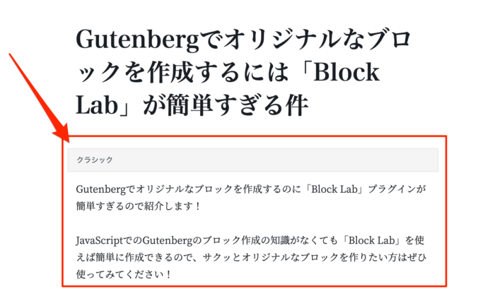 Gutenbergにはいくつかのブロックがあるわけですが、旧エディタで作成されたコンテンツをGutenbergエディタで表示させると、すべてのコンテンツがまるごと「クラシック」ブロックに入ることが分かるはずです。