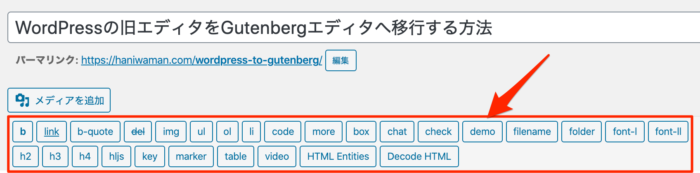 昔だと「AddQuicktag」などで独自のデザインを作成していたかと思いますが、Gutenbergではこれらのボタンが機能しません。