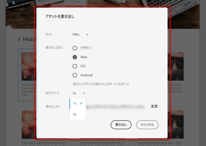 | 設定サイズ | 「1x」と「2x」が選べます。1倍か2倍って意味ですが、1倍を選んでも2倍のキャパがある画像なら2倍の画像も出力されます。特に気にせず「1x」でいいかと思います。 |