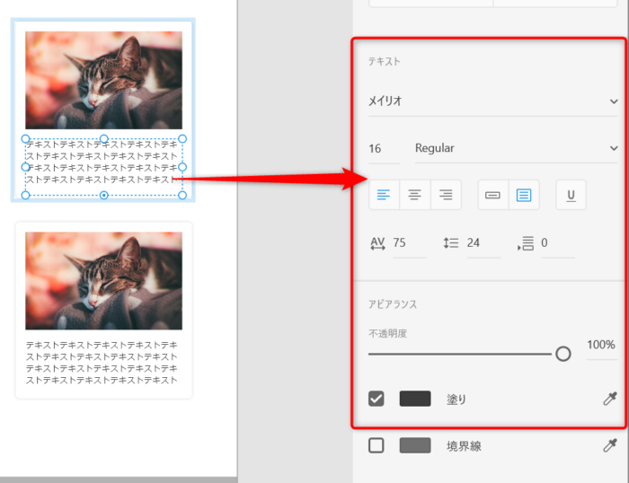 選択ツールで文字エリアを選択すると右のエリアに各種値が表示されます。