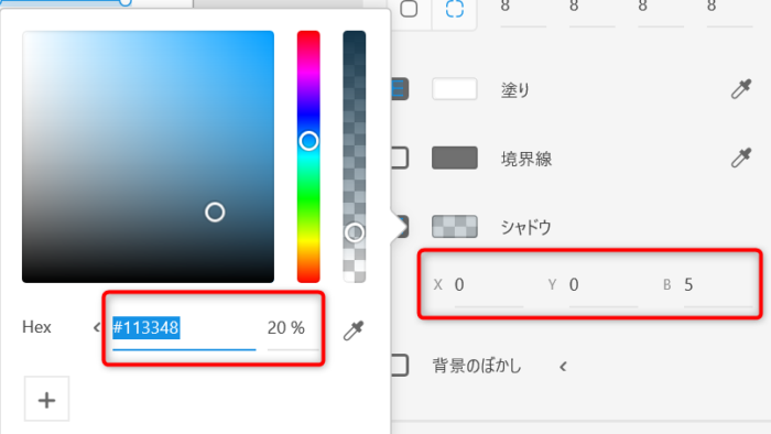 xがx軸の距離、yがy軸の距離、bがぼかしの距離、そして#113348の20%が影の色ということです。CSSの記述だとbox-shadow: 0 0 5px 0 rgba(17, 51, 72, 0.2);といった感じで表現できるはずです!